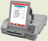 The voter navigates through the ballot and makes choices through either the touch screen or the navigation keys on the right.